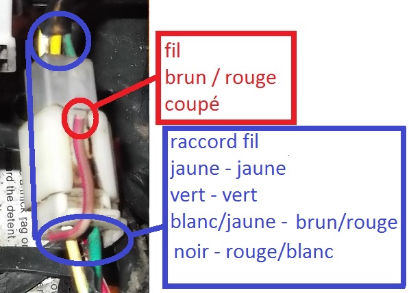 gregx1980 a écrit:photo 3 je ne sais pas ce que ces mais le fil qui démarre (blanc avec une ligne jaune ) après le raccord devient ( brun avec une ligne rouge ) il a était coupé donc lui non plus je ne sais pas ou il vas