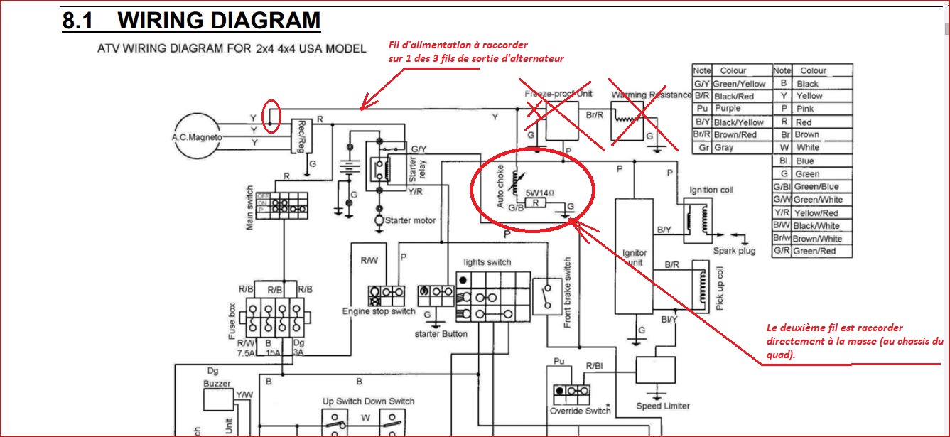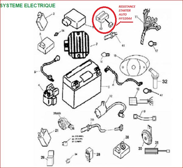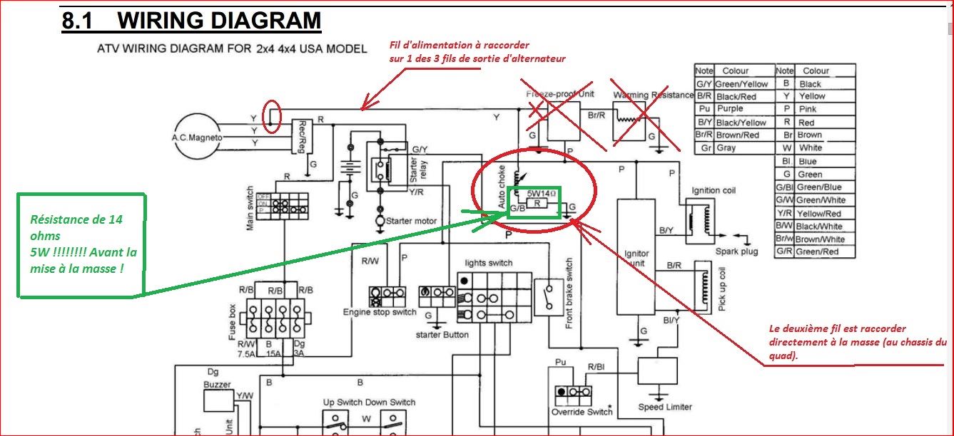 Ne branches pas tout de suite le fil VERT à la masse, je dois vérifier si cette résistance est intégrée ou si elle est fixée quelque part sur le chassis de ton quad !