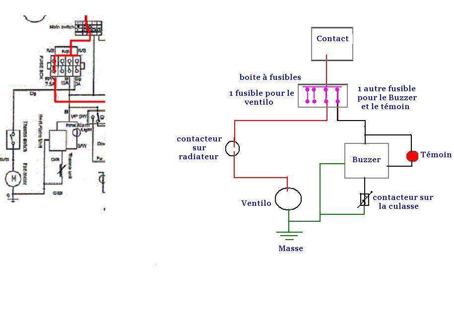 donc un contacteur est pour le ventilo et l'autre pour le buzzer, celui du radiateur pour le ventilo et celui de la culasse pour le buzzer