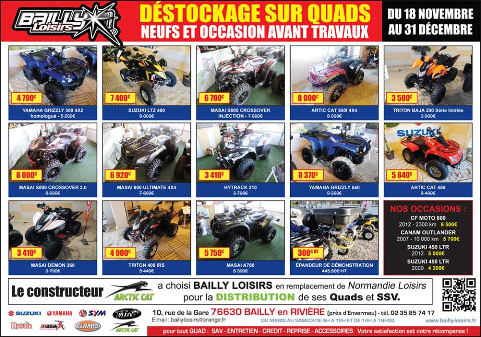 bailly loisirs votre nouveau concessionaire artic cat , pour la haute normandie prés de dieppe , a votre service depuis 11 ANS ! , vous propose ce quad artic cat 550S NEUF, avec direction assistée treuil warn , injection , homologué deux places , etc , ( modele 2012 neuf ) au tarif exceptionnel de 8 [...]