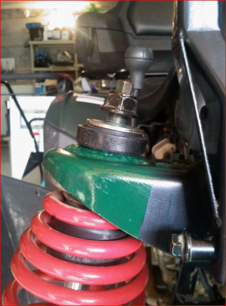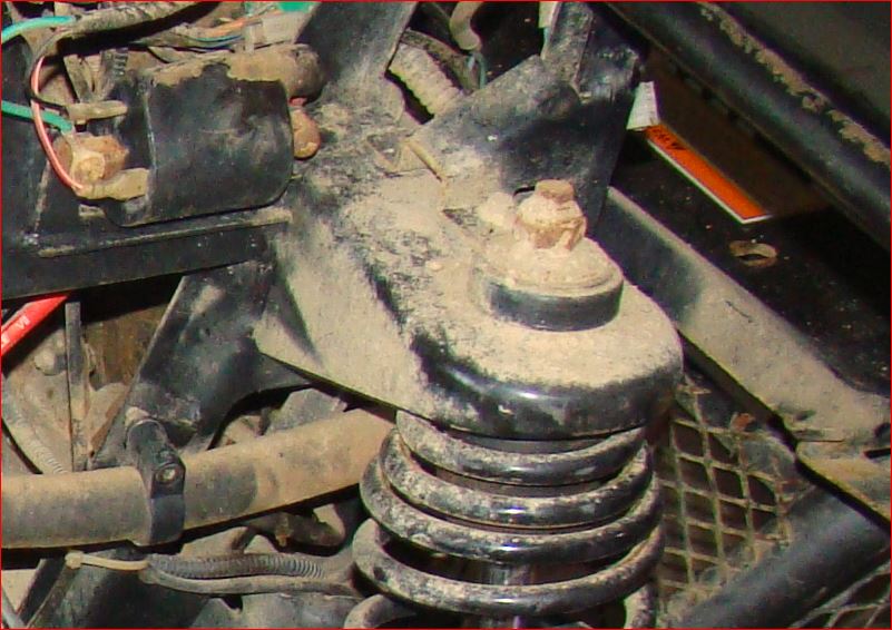 3 - Enduire de graisse la rotule inférieure, en plastique noire semi-sphérique ( En soulevant, légèrement, le quad pour dégager l'amortisseur ).