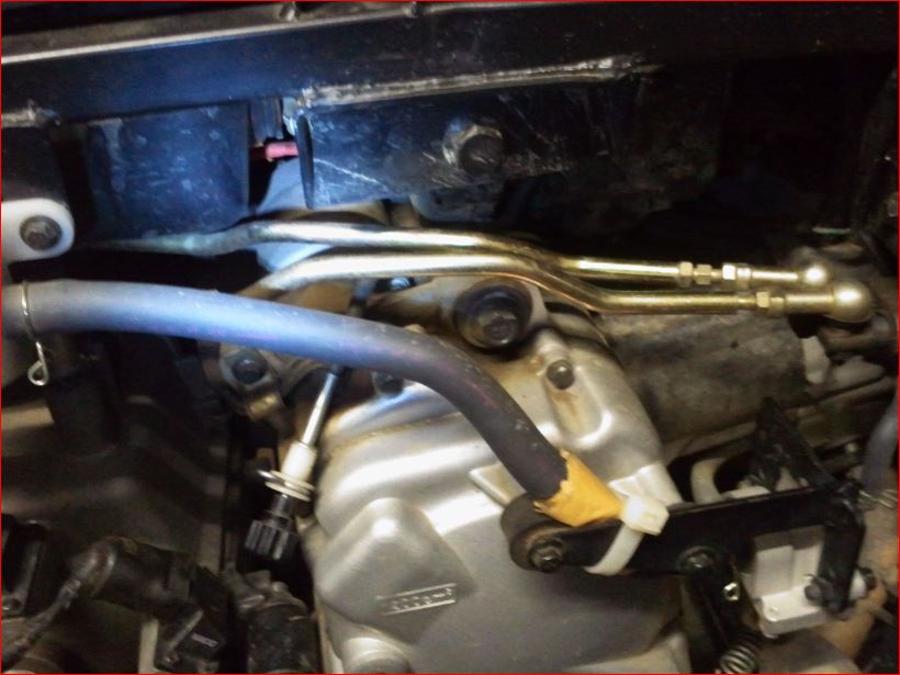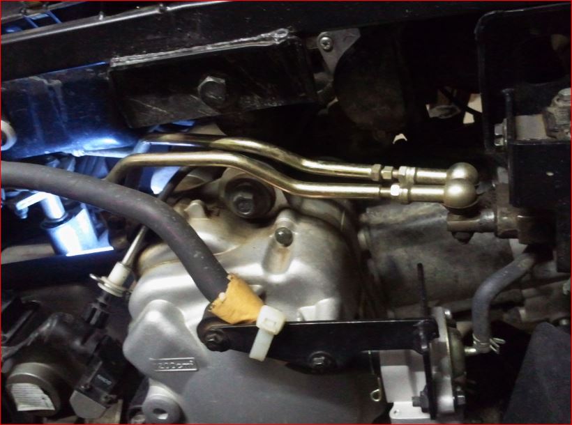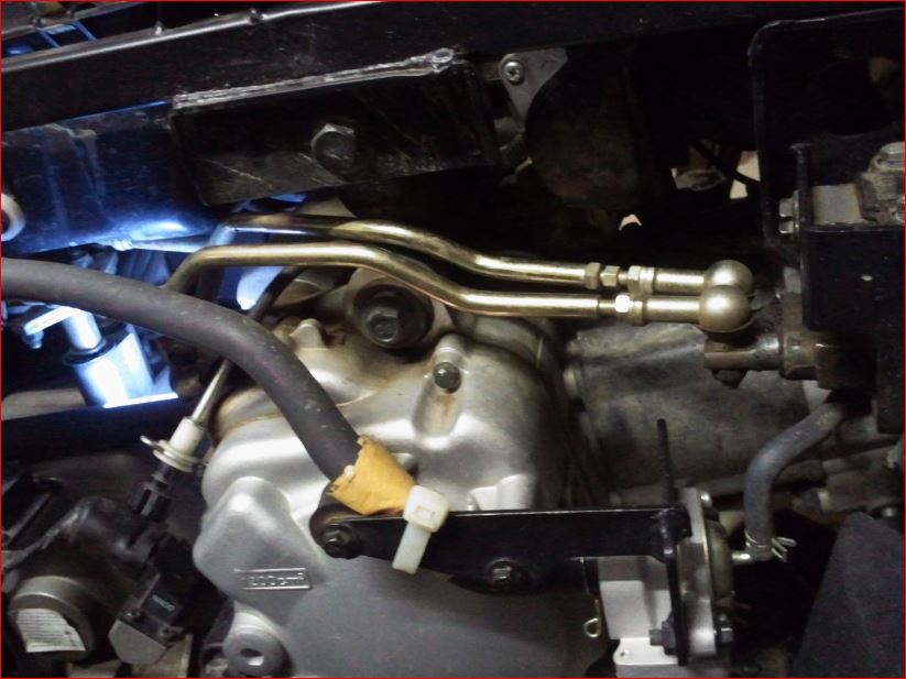 Voici une vue d'ensemble avec les endroits où la tringlerie pour la vitesse courte touche. L'image est prise au point mort. vitesse courte enclenchée, la boite à air monte encore plus.