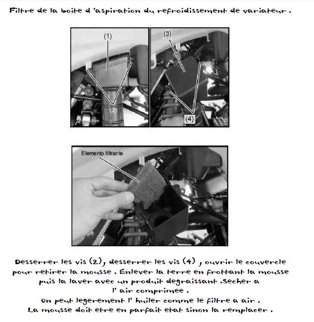 Sur mon KXR 250 la prise d'air du variateur qui est sous l'aile AV gauche est bien garnie du mousse filtrante . La sortie ( je présume) d'air du variateur , qui elle , est sous l'aile AR n'en a pas et il y a des projections de boue .... Qui peut me dire si il y en a une a l'origine ?